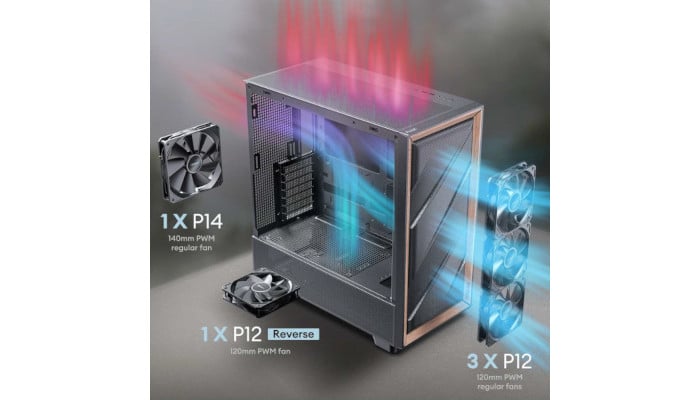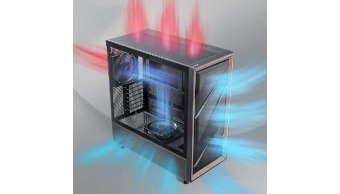 Multi-directional vent design, featuring extensive air intakes at the bottom, power supply chamber and lower sides, along with top vents and large-area mesh at the front, creating a dedicated Antec Flux airflow channel.