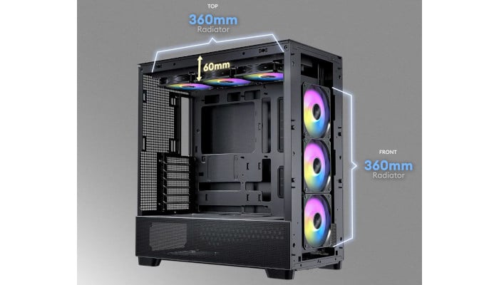 Supports simultaneous installation of Front 360mm radiator + Top 360mm radiator.
