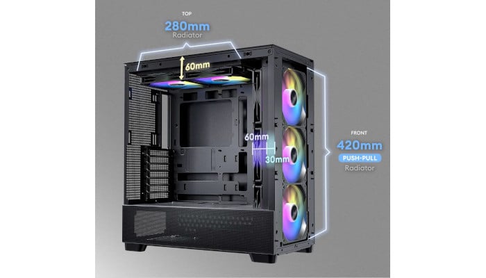 Supports simultaneous installation of Front 420mm push-pull radiator + Top 280mm radiator.