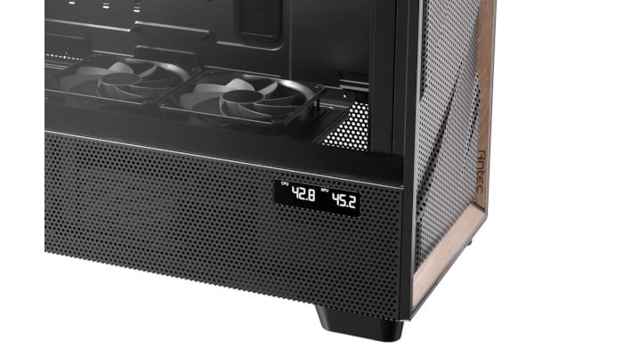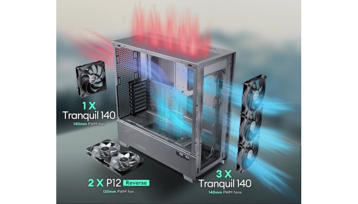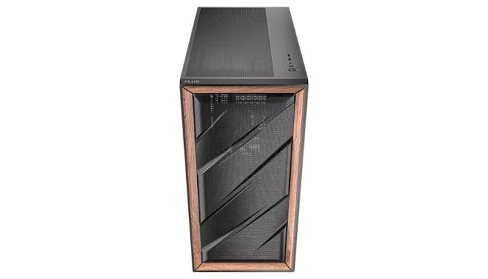 Multi-directional vent design, featuring extensive air intakes at the bottom, power supply chamber and lower sides, along with top vents and large-area mesh at the front, creating a dedicated Antec Flux airflow channel.
