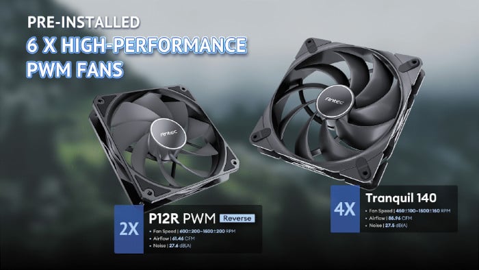 | Bottom Fan Support | 3 x 120mm (2 x 120mm PWM Reverse fan on PSU shroud) |