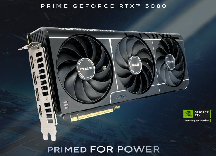 Experience Primal performance with the Prime GeForce RTX 5080, an SFF-ready graphics card featuring a 2.5-slot design for expansive compatibility, enhanced by a triple-fan setup for supreme airflow and vapor chamber design for supreme cooling.