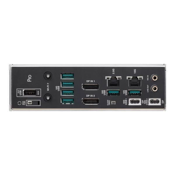 | Back Panel Connectors | 2 x USB4® (40Gbps) ports (2 x USB Type-C®) 6 x USB 10Gbps ports (6 x Type-A) 1 x USB 2.0 port (1 x Type-A) 2 x DisplayPort IN 1 x Wi-Fi Module 1 x Marvell® AQtion 10Gb Ethernet port 1 x Intel® 2.5Gb Ethernet port 2 x Audio jacks 1 x BIOS FlashBack™ button 1 x Clear CMOS button |