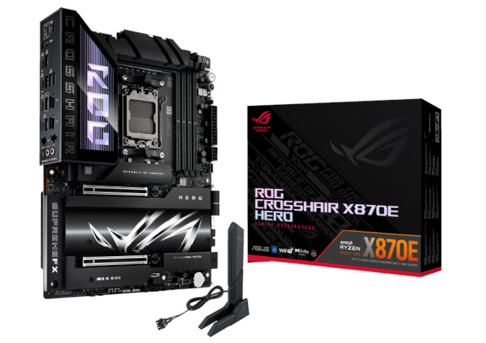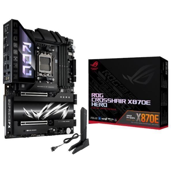 The AI PC-ready ROG Crosshair X870E Hero offers unyielding power delivery, robust thermal management, hyperspeed connectivity, comprehensive PCIE 5.0 and DDR5 support to unleash the performance of AMD Ryzen™ 9000 Series processors. Dark hues predominate across this motherboard, drawing your attention to premium metallic textures, nickel-plated surfaces, sleek contours and a stereoscopic visual effect on the large M.2 and chipset heatsink. This board also features the Polymo Lighting II effect. This upgraded lighting module built into the I/O shroud provides more dynamic RGB illumination for the signature ROG logo.