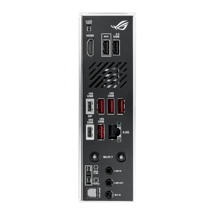 | Back Panel Connectors | 1 x USB 20Gbps port(s) 5 x USB 10Gbps port(s) (4 x Type-A + 1 x USB Type-C with DP Alt mode) 2 x USB 2.0 port(s) (2 x Type-A) 1 x HDMI port 1 x Wi-Fi module 1 x Intel 2.5Gb Ethernet port 3 x Audio jacks 1 x Optical S/PDIF out port 1 x BIOS FlashBack button 1 x Clear CMOS button 1 x FlexKey button |