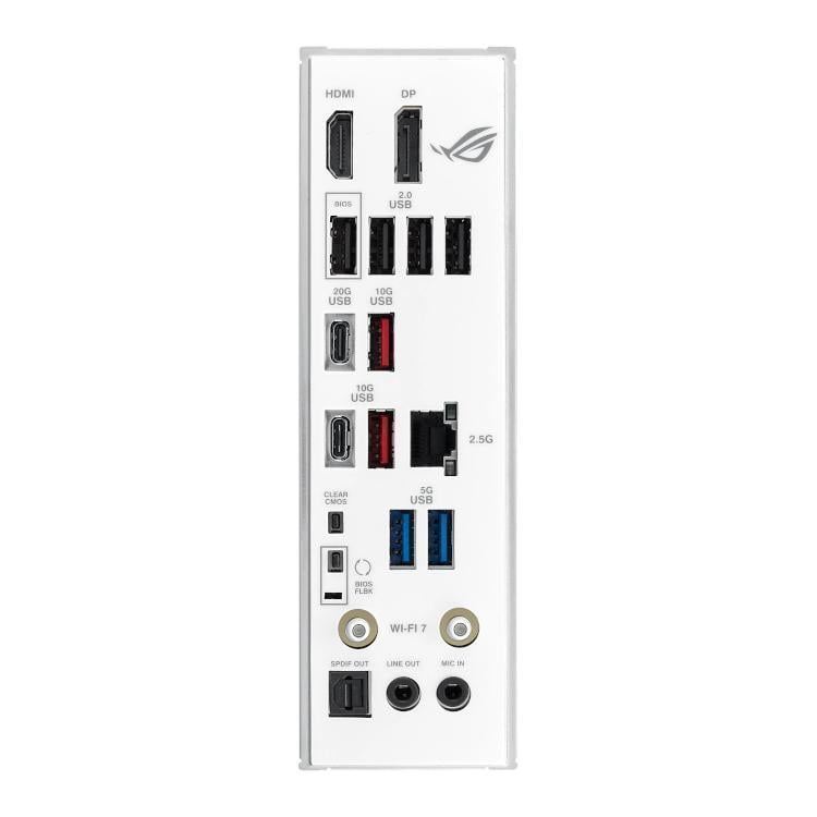 | Back Panel Connectors | 1 x USB4 (20Gbps) port (1 x USB Type-C) 3 x USB 10Gbps ports (2 x Type-A + 1 x USB Type-C) 2 x USB 5Gbps ports (2 x Type-A) 4 x USB 2.0 ports (4 x Type-A) 1 x DisplayPort 1 x HDMI port 1 x Wi-Fi module 1 x Intel 2.5Gb Ethernet port 2 x Audio jacks 1 x Optical S/PDIF out port 1 x BIOS FlashBack button 1 x Clear CMOS button |