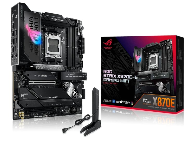 The ROG Strix X870E-E Gaming WiFi is engineered to harness the full potential of AMD Ryzen 9000 Series processors. Featuring PCIe 5.0 support, AI Overclocking, AI Cooling II, AI Networking II, and AEMP, setup is streamlined while performance is maximized. Dual USB4® Type-C ports and WiFi 7 with Realtek 5Gb Ethernet ensure top-tier connectivity, while robust heatsinks keep M.2 drives cool under heavy loads. This motherboard not only meets the demands of gaming and professional applications but also delivers the power and connectivity essential for advanced AI PC applications.
