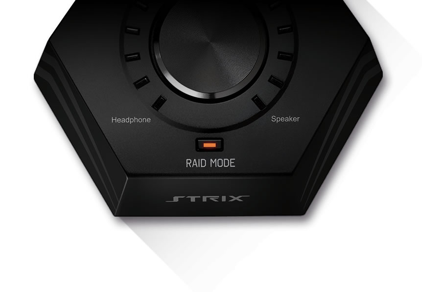 ASUS exclusive Raid Mode can be turned on right in the heat of gaming action with just one-click on the audio control box to provide the exact audio adjustment you want. With this powerful combination of Raid Mode and the audio control box, gamers no longer need to pause the game and open sound software to adjust their audio, ensuring they never miss a single moment of gaming action. Gamers can save their favorite or most frequently-used audio adjustments — Equalizer, Bass Boost, Virtual Surround, and Mic Volume — into custom presets that they can instantly turn on or off with the dedicated Raid Mode button on the audio control box. It also has a convenient knob to adjust the Raid Mode intensity level.