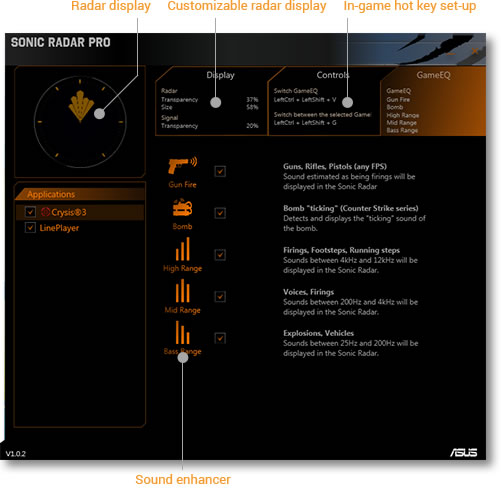 Modern games are more than graphics – precise audio positioning gives gamers a distinct edge over enemies. That's why Strix Raid DLX includes Sonic Radar Pro, an ASUS exclusive technology that visualizes and enhances in-game sounds, giving you a vital edge in first-person shooters. Fire up your favorite game and Sonic Radar Pro displays a ‘radar' HUD (heads-up display) that pinpoints in-game actions relative to your position, so you'll know exactly where you are on the battlefield and what's happening around you!