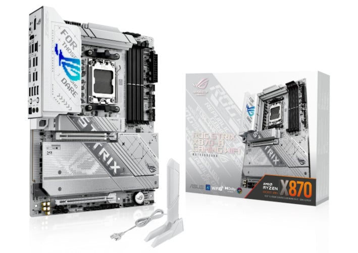 Elevate your build with the ROG Strix X870-A Gaming WiFi. Featuring a sleek white PCB and support for AMD Ryzen™ 9000 Series processors, this motherboard delivers the power and connectivity needed for advanced AI applications. With DDR5 support, full PCIe 5.0 capabilities, dual USB4® ports, and WiFi 7, it's the ultimate blend of style and performance.