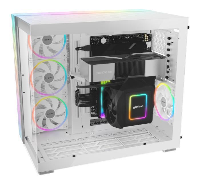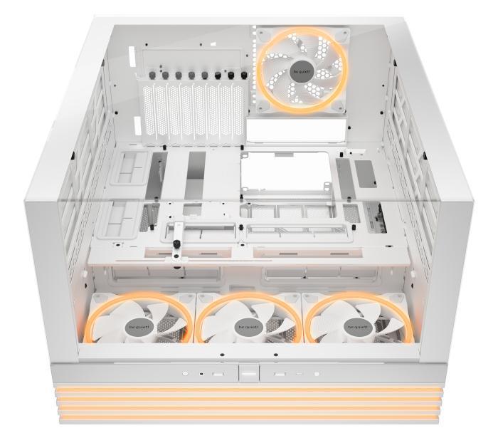 The 4 pre-installed fans can be expanded to up to 10 in total, making Light Base 900 FX Black extremely versatile. With its extra spacious design, it can hold up to two 420mm radiators simultaneously, an E-ATX motherboard and even the most powerful graphics cards. Thanks to the two-chamber design, drives and cables are neatly tucked in the back and do not get in the way of airflow.