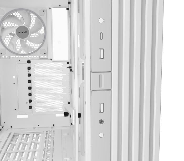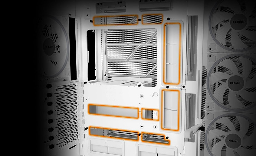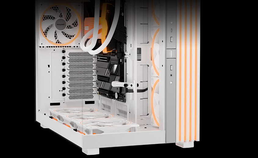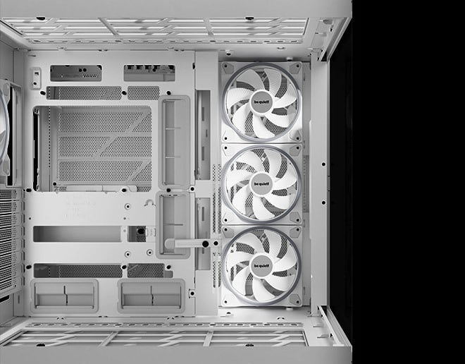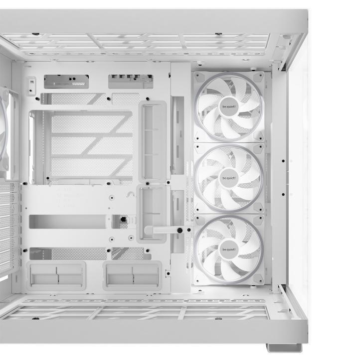 Light Base 900 FX Black comes with 4 pre-installed Light Wings fans. One fan is installed as rear exhaust, 3 Light Wings 140mm PWM fans with reversed fan blades are pre-installed on the side mounting. The reverse fans make sure your system is still an eye-catcher when installed as a side intake. Their 7 airflow-optimized fan blades not only reduce noise-generating turbulences but also ensure that this fan provides the performance that is needed, even in demanding configurations.