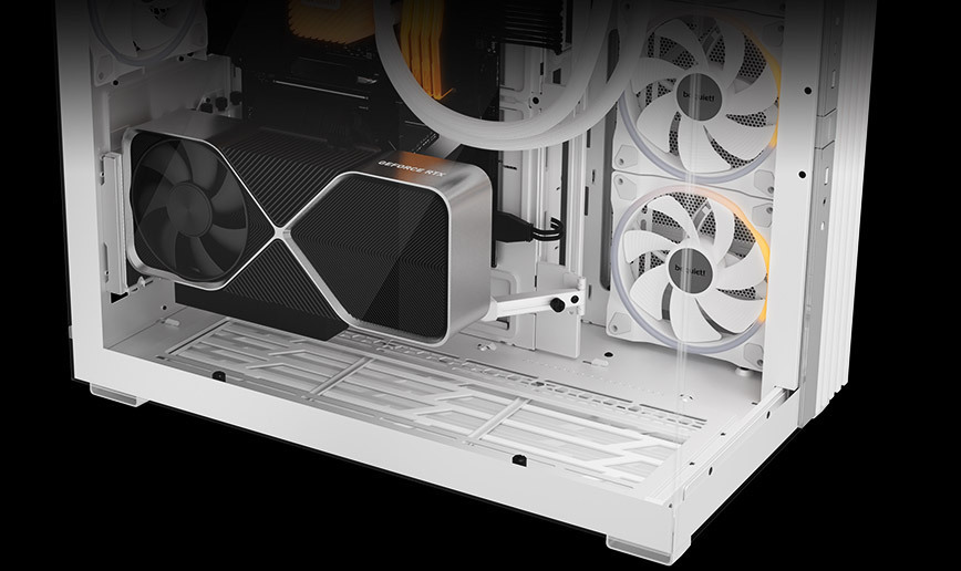 Light Base 900 FX Black features a flexible VGA holder that subtly prevents your GPU from sagging. The best part: This holder works in any orientation and with a horizontally or vertically installed graphics card. The result is a clean look even if you use big and heavy graphics cards.