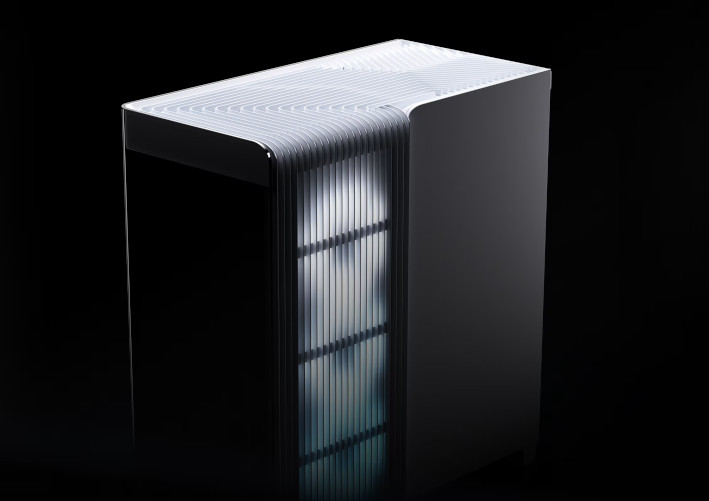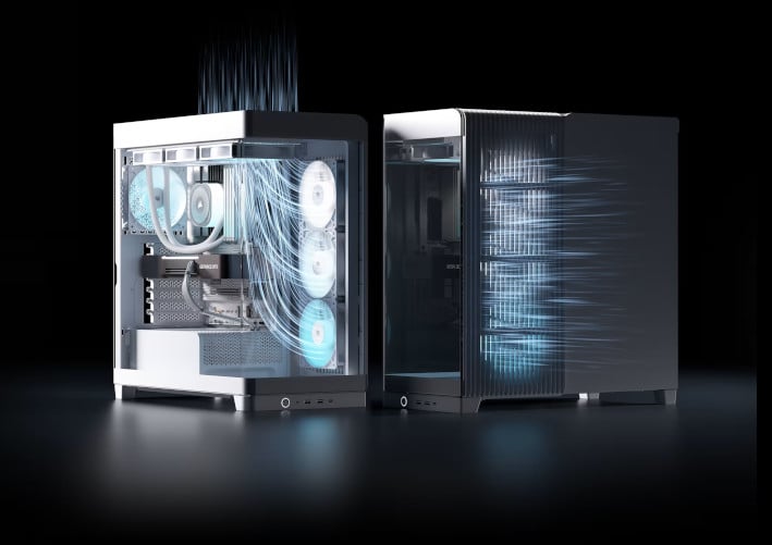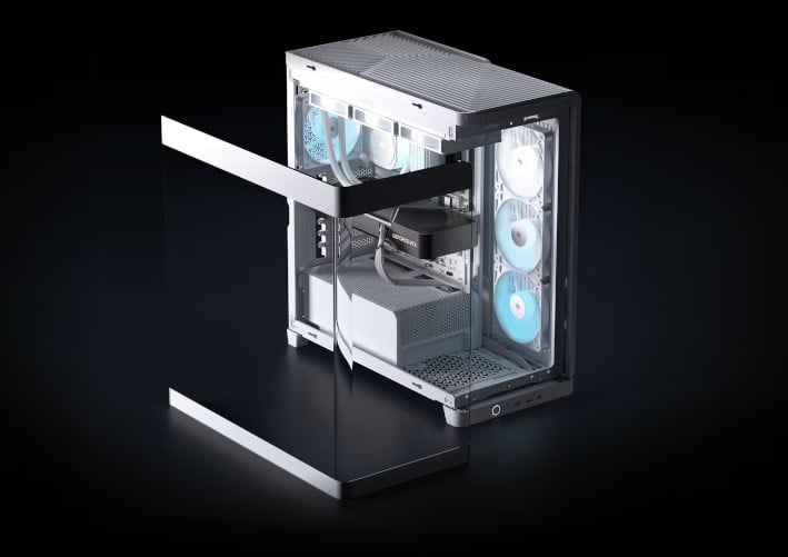 The side-mounted reverse-rotor intake fans pull cool air in from outside the chassis, while top-mounted fans (sold separately) exhaust hot air out of the case to keep the interior frosty.