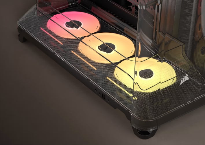 Preinstalled reverse-rotor iCUE LINK LX-R RGB 120mm fans in the bottom of the chassis allow for efficient, low-noise cooling with glorious, unobstructed RGB lighting.
