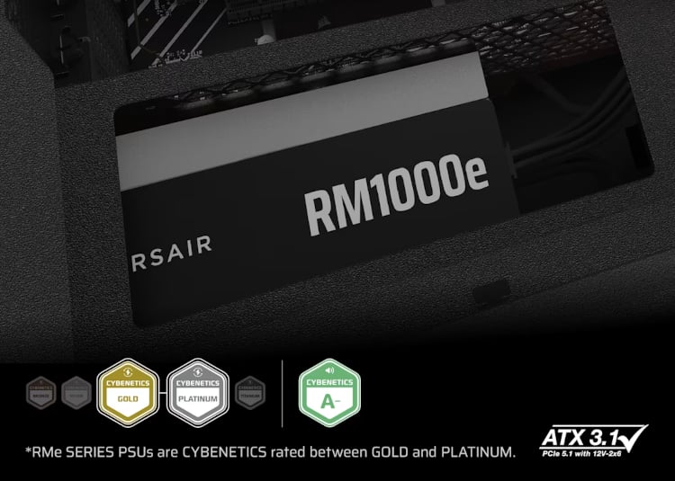 CORSAIR RMe Series Fully Modular Low-Noise Power Supplies include a dedicated 12V-2x6 GPU power cable, ATX 3.1 certification and PCIe 5.1 compliance, and Cybenetics™ Gold rated efficiency for a quiet, reliable build. The RMe PSUs' compact size also allow for easier cable management.