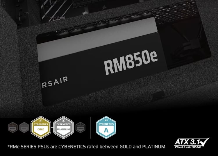 CORSAIR RMe Series Fully Modular Low-Noise Power Supplies include a dedicated 12V-2x6 GPU power cable, ATX 3.1 certification and PCIe 5.1 compliance, and Cybenetics™ Gold rated efficiency for a quiet, reliable build. The RMe PSUs' compact size also allow for easier cable management.