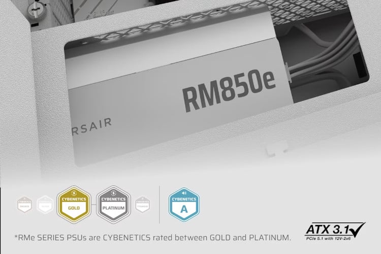 CORSAIR RMe Series Fully Modular Low-Noise Power Supplies include a dedicated 12V-2x6 GPU power cable, ATX 3.1 certification and PCIe 5.1 compliance, and Cybenetics™ Gold rated efficiency for a quiet, reliable build. The RMe PSUs' compact size also allow for easier cable management.