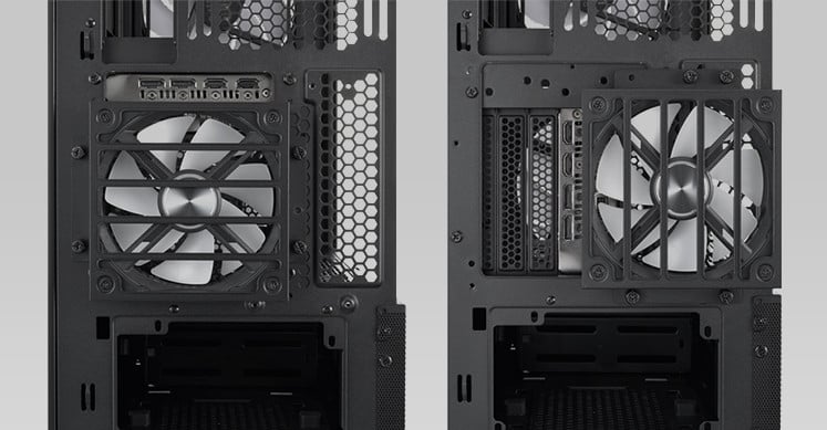 The GPU placed at the top of the expansion slots in air cooling mode opens up the possibility to add a 120mm fan at the rear of the case without obstructing the GPU I/O. This is also possible with a vertically mounted GPU in both air-cooled and water-cooled mode. The additional 120mm fan provides better cooling for the GPU and a greater intake/exhaust balance for the system.