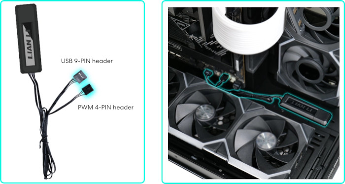 Power each group of fans by connecting the PWM cable on the receiver to the motherboard. The cable length can be shorten by winding it around the organizer on the receiver.