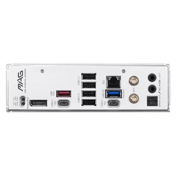 | Back Panel Connectors | 1 x Clear CMOS Button 1 x USB 10Gbps (Type-A) 4 x USB 2.0 1 x 5G LAN 1 x Wi-Fi / Bluetooth 1 x Audio connectors 1 x Flash BIOS Button 1 x DisplayPort 2 x USB 10Gbps (Type-C) 1 x SB 5Gbps (Type-A) 1 x S/PDIF-OUT |