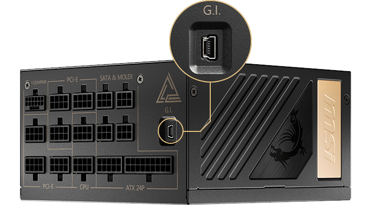 This power supply is fully supported by MSI Gaming Intelligence, which helps optimize user experience with adjustable settings. Please connect the mini USB cable to sync the power supply’s information.