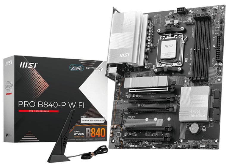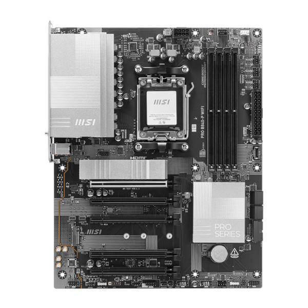 PRO B840-P WIFI offers a simple design with a harmonious silver color scheme that perfectly matches both white and black PC builds. It is engineered with many exclusive features of MSI, a true Wi-Fi 7 with EZ Antenna, 2.5G LAN, and PCIe 4.0 M.2 with EZ M.2 Shield Frozr II, ready for the AMD Ryzen™ 9000 series processors.