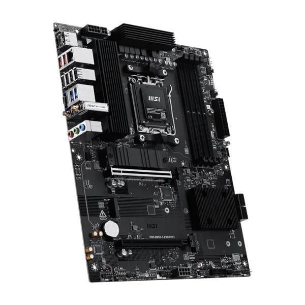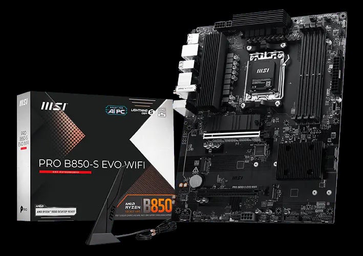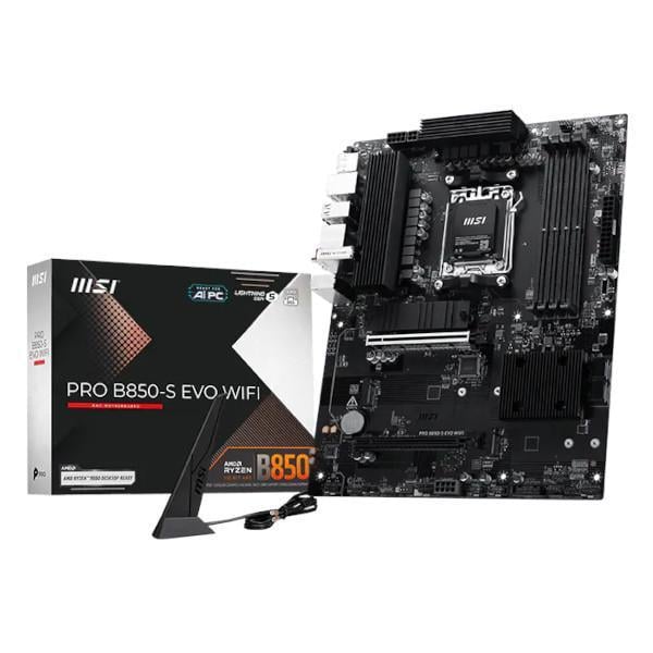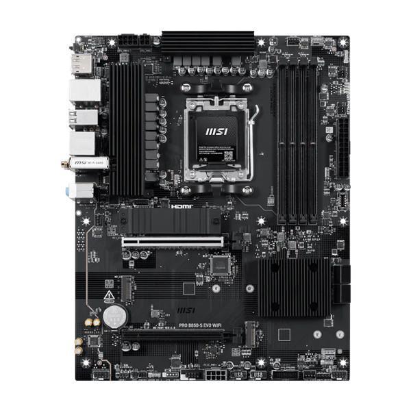 PRO B850-S EVO WIFI offers a simple design with a harmonious black color scheme that perfectly matches black PC builds. It is engineered with many exclusive features of MSI, a Wi-Fi 7 with EZ Antenna, 5G LAN, PCIe 5.0 M.2 with M.2 Shield Frozr, EZ PCIe Clip II, and Supplemental PCIe Power, ready for the AMD Ryzen™ 9000 series processors.