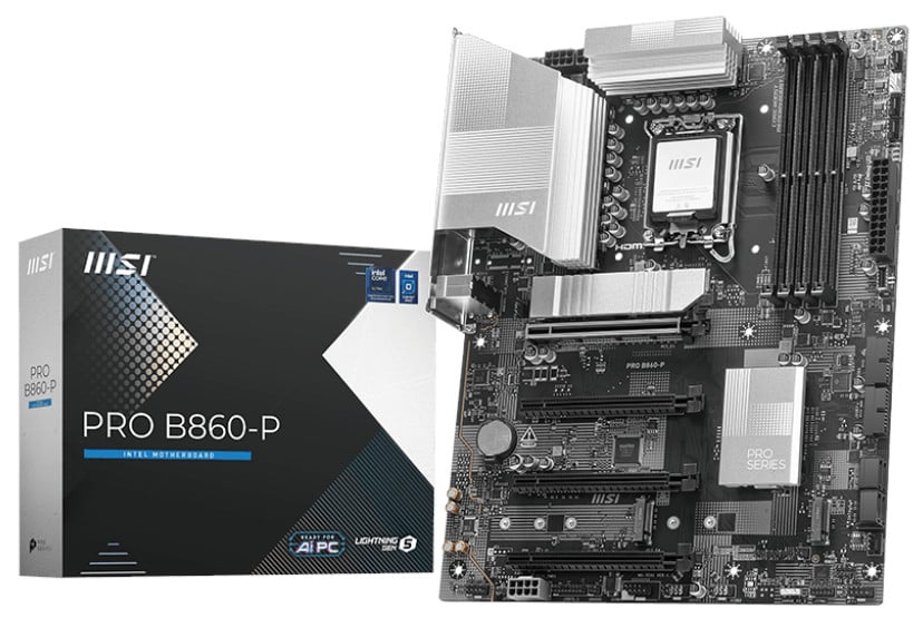 PRO B860-P offers a simple design with a harmonious silver color scheme that perfectly matches both white and black PC builds. It is engineered with many exclusive features of MSI, 5G LAN, Thunderbolt 4, PCIe 5.0 M.2, and Supplemental PCIe Power, ready for the Intel® Core™ Ultra processors.