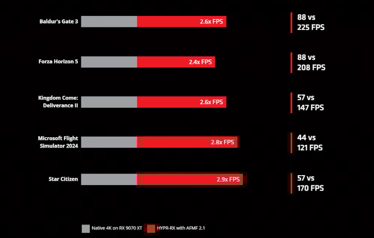 MD FidelityFX™ Super Resolution (FSR) uses cutting-edge upscaling and advanced frame generation technologies to help boost performance in supported games, delivering incredible quality and ultra-fast gaming on virtually any hardware. Available exclusively on the AMD Radeon™ RX 9000 series graphics cards, users can upgrade select FSR 3.1 games to FSR 4 using AMD Software: Adrenalin Edition™ 25.3.1 or newer. AMD FSR 4 uses an AI-accelerated upscaling algorithm to deliver image quality improvements over AMD FSR 3.1.