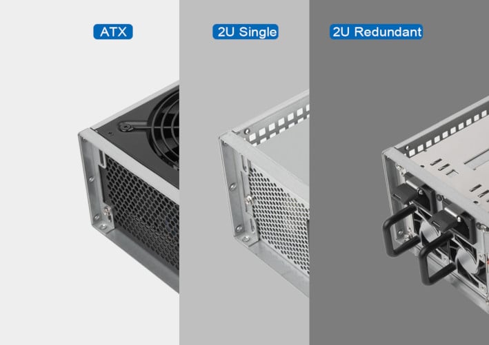 Supports ATX (PS2) / 2U single / 2U redundant power supplies