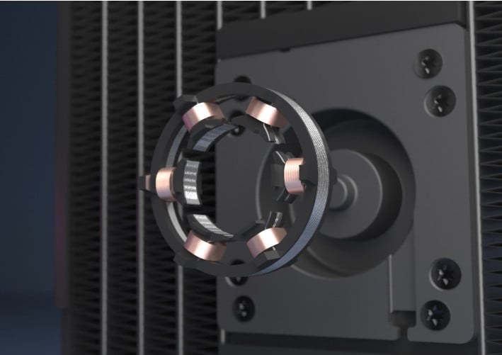 A three phase, six pole motor integrated within the radiator to reduce the pumps overall output noise level.