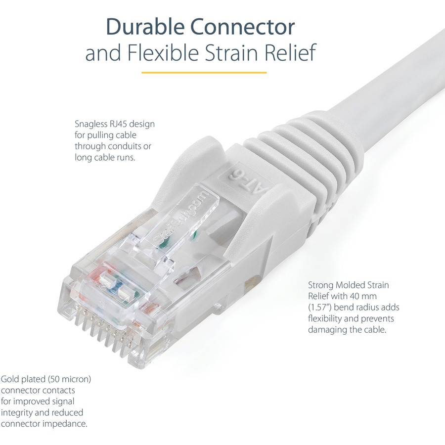 To ensure long-lasting performance, this high quality Cat 6 patch cable features a snagless design that protects the RJ45 connector clips from damage and makes the cable less prone to snagging during installation. The cable also features molded PVC strain relief that prevents the RJ45 connector termination points from bending at sharp angles, reducing the risk of cable failure.