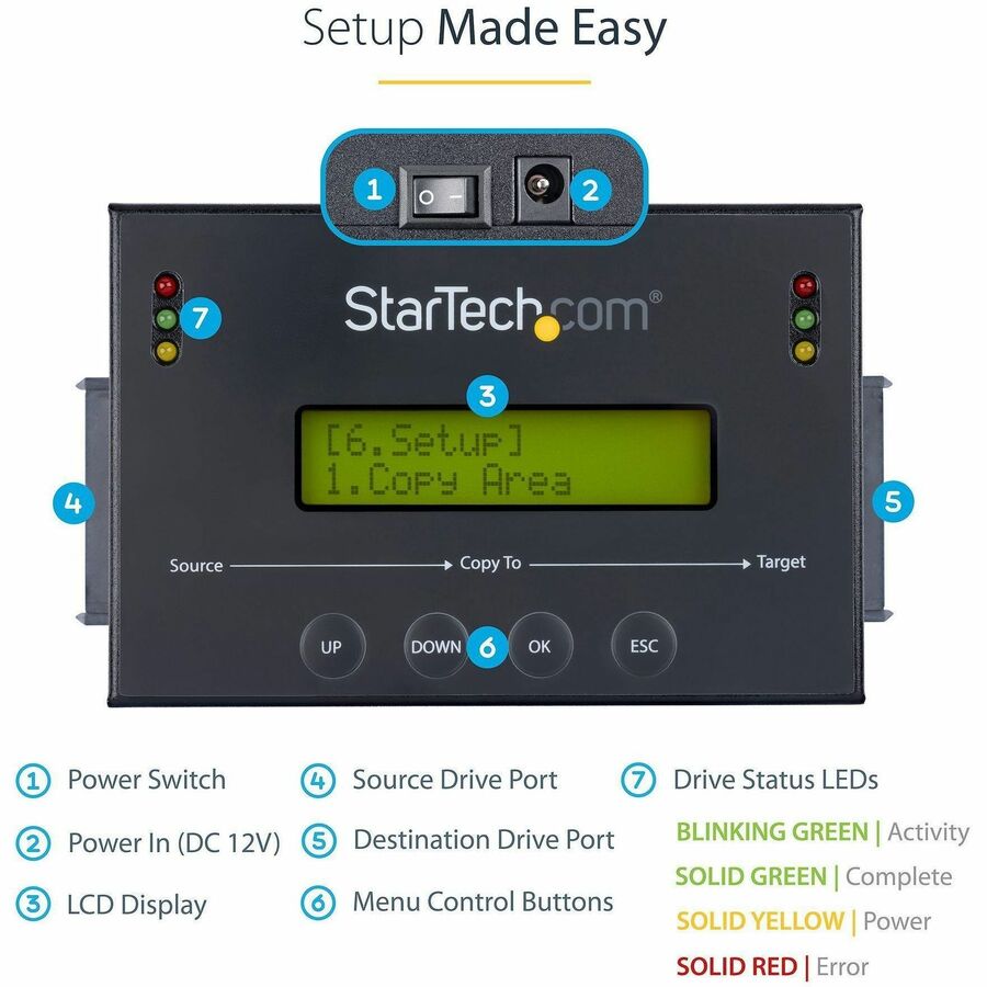 Complete with integrated LCD display, and support for 2.5" and 3.5" SATA I/II/III hard drives (HDD) and Solid State Drives (SSD), the SATDUP11is a user-friendly all-in-one solution for any application requiring hard drive duplication or erasing.