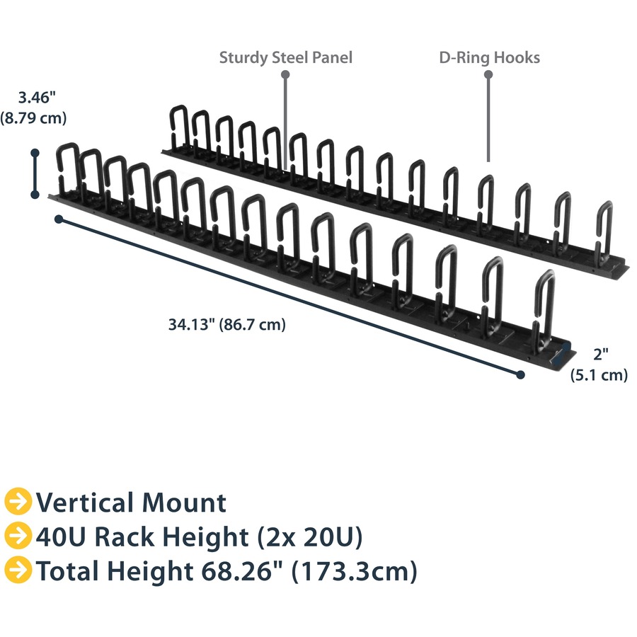 The two-piece cable manager runs vertically along the side of your rack, to neatly guide cables between equipmentthat'smounted at different heights. This provides a tidy and well-organized way to run cables from devices mounted toward the bottom of your rack to other devices mounted near the top, without leaving a mess of cables hanging in between.