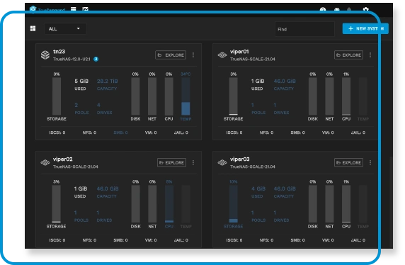 The H-Series was built for painless operation and maintenance with its modular hardware design. Additional integrated enclosure management capabilities save time and effort by providing graphical visualization of the system in the UI, making it easy to monitor the state of your system from a single screen. Optional TrueCommand software allows managing multiple TrueNAS units from a single control panel.
