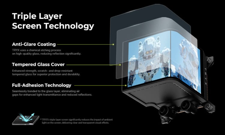 TRYX uses a chemical etching process on high-quality glass, reducing reflection significantly. Enhanced strength, scratch and drop resistant tempered glass for superior protection and durability. Seamlessly bonded to the glass layer, eliminating air gaps for enhanced light transmittance and reduced reflections.