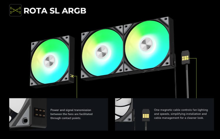 Power and signal transmission between the fans are facilitated through contact points. One magnetic cable controls the fan lighting and speed, simplifying installation and cable management for a cleaner look. Each fan is equipped with a fluid dynamic bearing and 8 ARGB Gen2 LEDs.